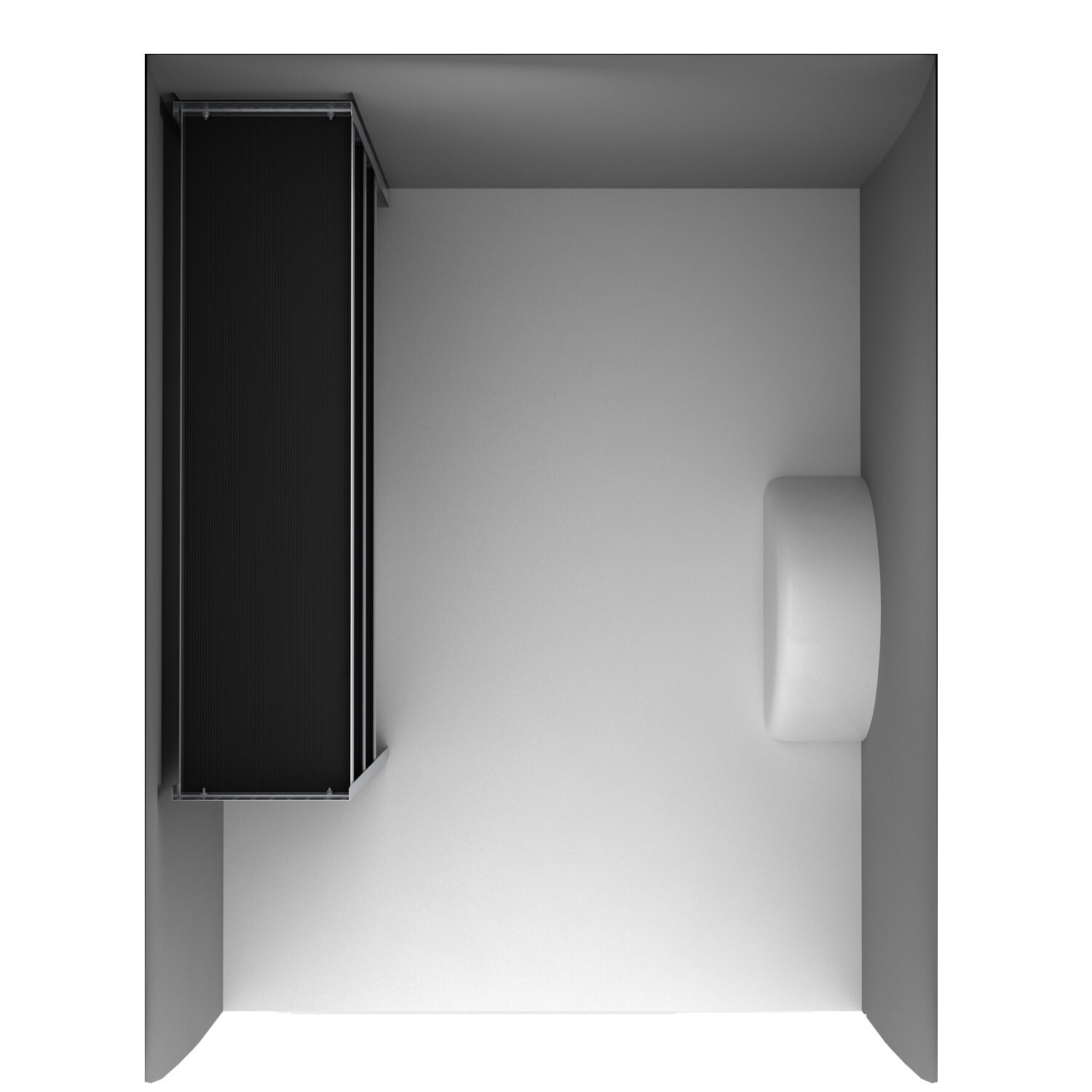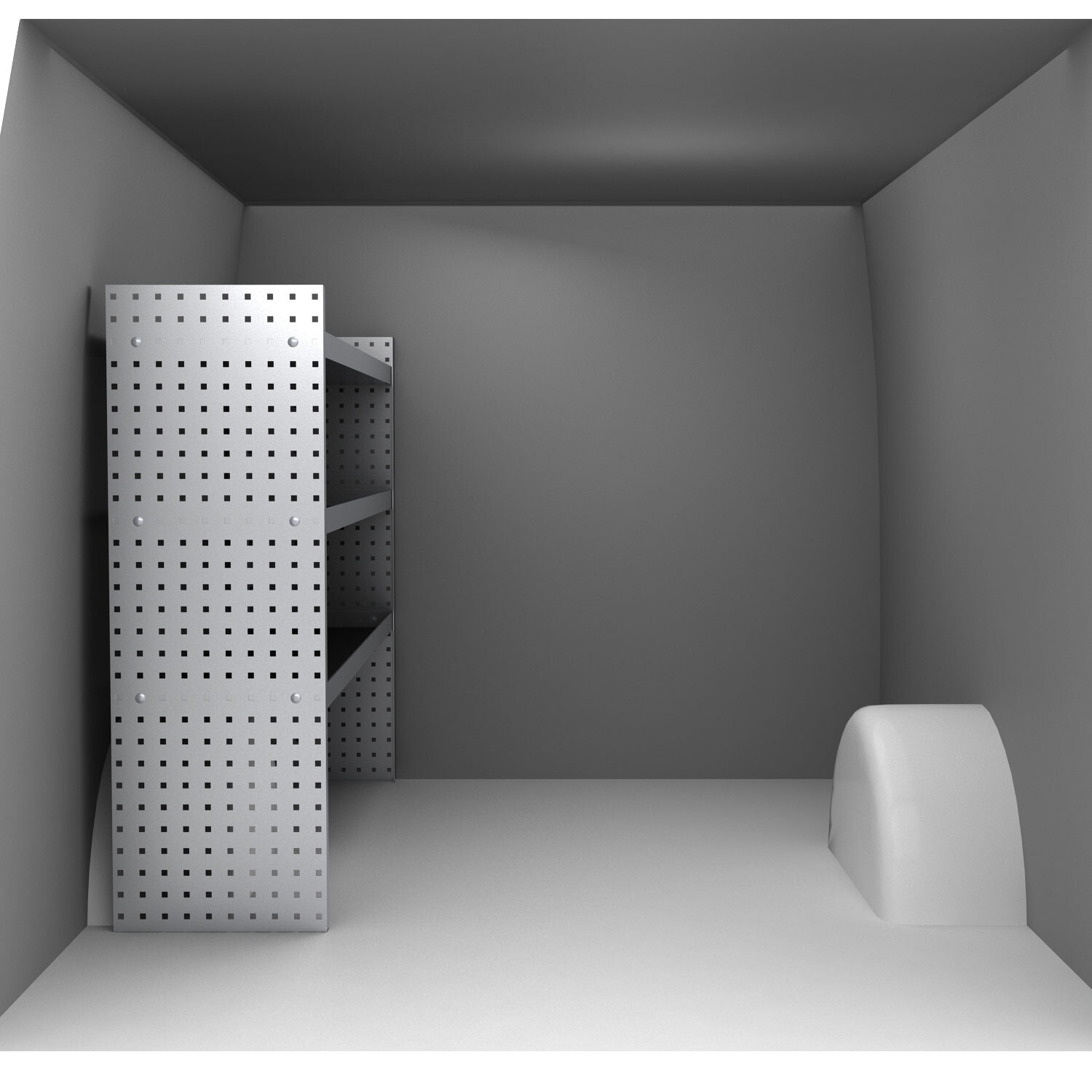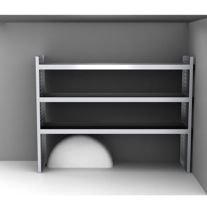 Indretningen er en simpel og stilfuld løsning til universelt brug, og består af en reol i fuld længde i venstre side med 3 gennemgående hylder med gummimåtte belægning i alle hylderne. Reolen er højden 100 cm, og har en total længde på 130 cm, samt en dybde på 33 cm. Hylderne er som hyldebakker og har en forhøjet kant på 3,5 cm der egner sig perfekt til universel opbevaring af kasser, spande, bøtter, værktøj og meget mere.