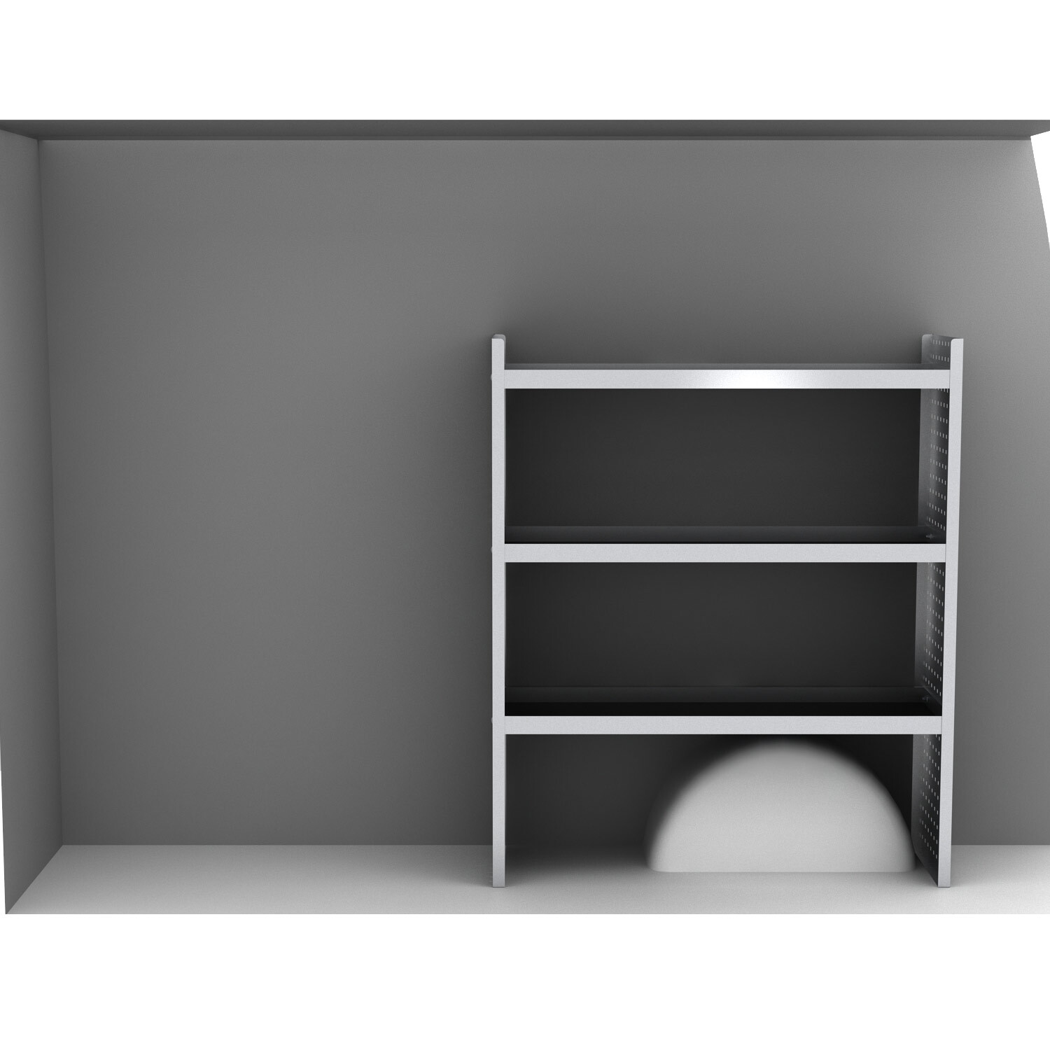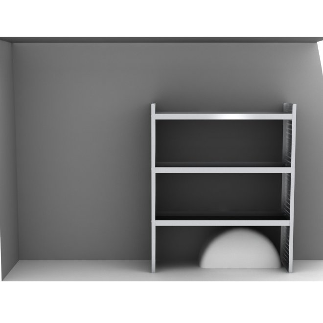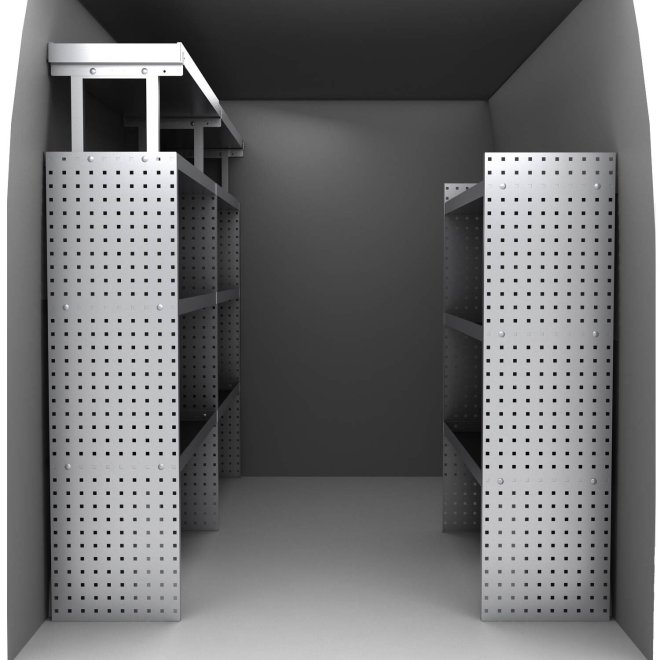 Der er øverst på reolen monteret en tophylde som går i hele bilens længde, perfekt til lister, vatterpas, rør og meget andet.