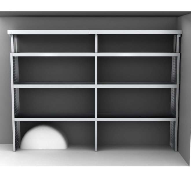 Indretningen er en simpel og stilfuld løsning til universelt brug, og består af en reol i fuld længde i venstre side med 3 gennemgående hylder (opdelt af en gavl midtvejs) med gummimåtte belægning i alle hylderne. Reolen er højden 120 cm, og har en total længde på 200 cm, samt en dybde på 33 cm. Hylderne er som hyldebakker og har en forhøjet kant på 3,5 cm der egner sig perfekt til universel opbevaring af kasser, spande, bøtter, værktøj og meget mere.