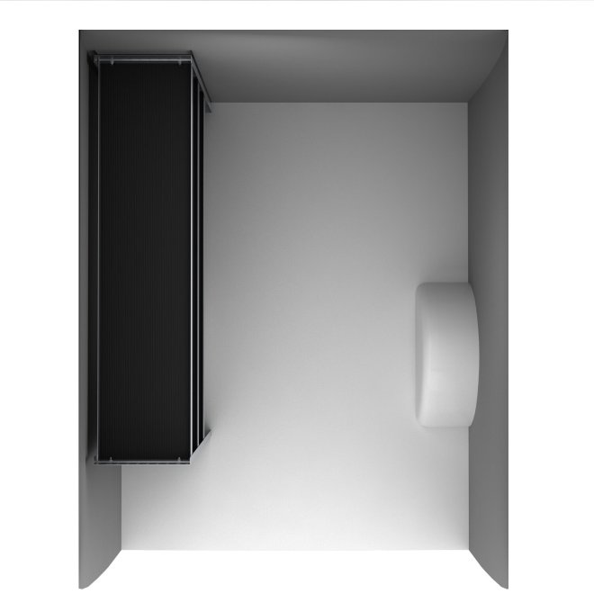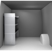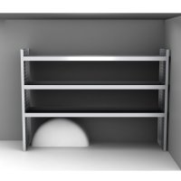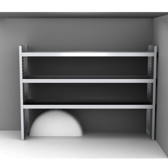 Indretningen er en simpel og stilfuld løsning til universelt brug, og består af en reol i fuld længde i venstre side med 3 gennemgående hylder med gummimåtte belægning i alle hylderne. Reolen er højden 100 cm, og har en total længde på 140 cm, samt en dybde på 33 cm. Hylderne er som hyldebakker og har en forhøjet kant på 3,5 cm der egner sig perfekt til universel opbevaring af kasser, spande, bøtter, værktøj og meget mere.
