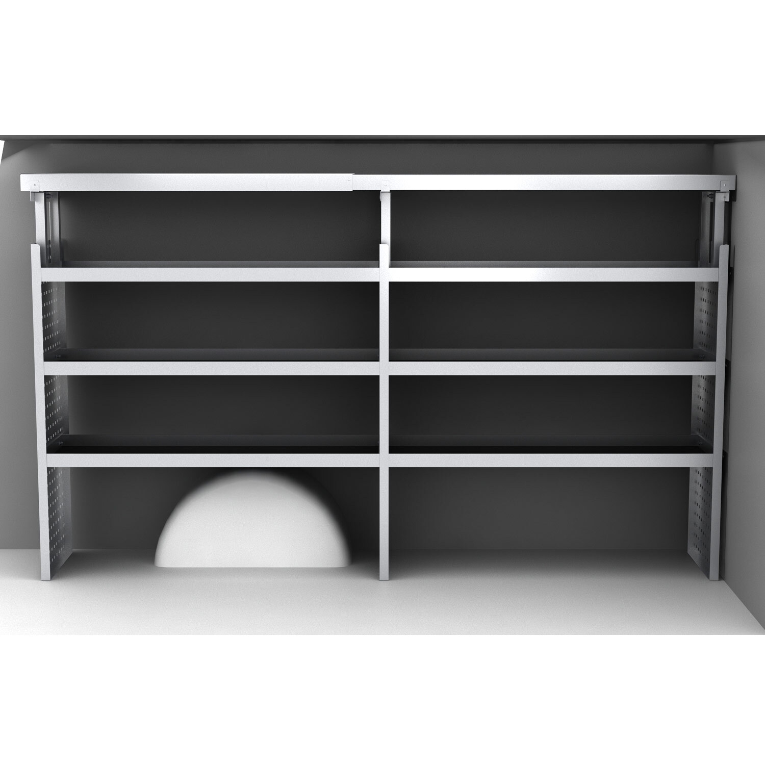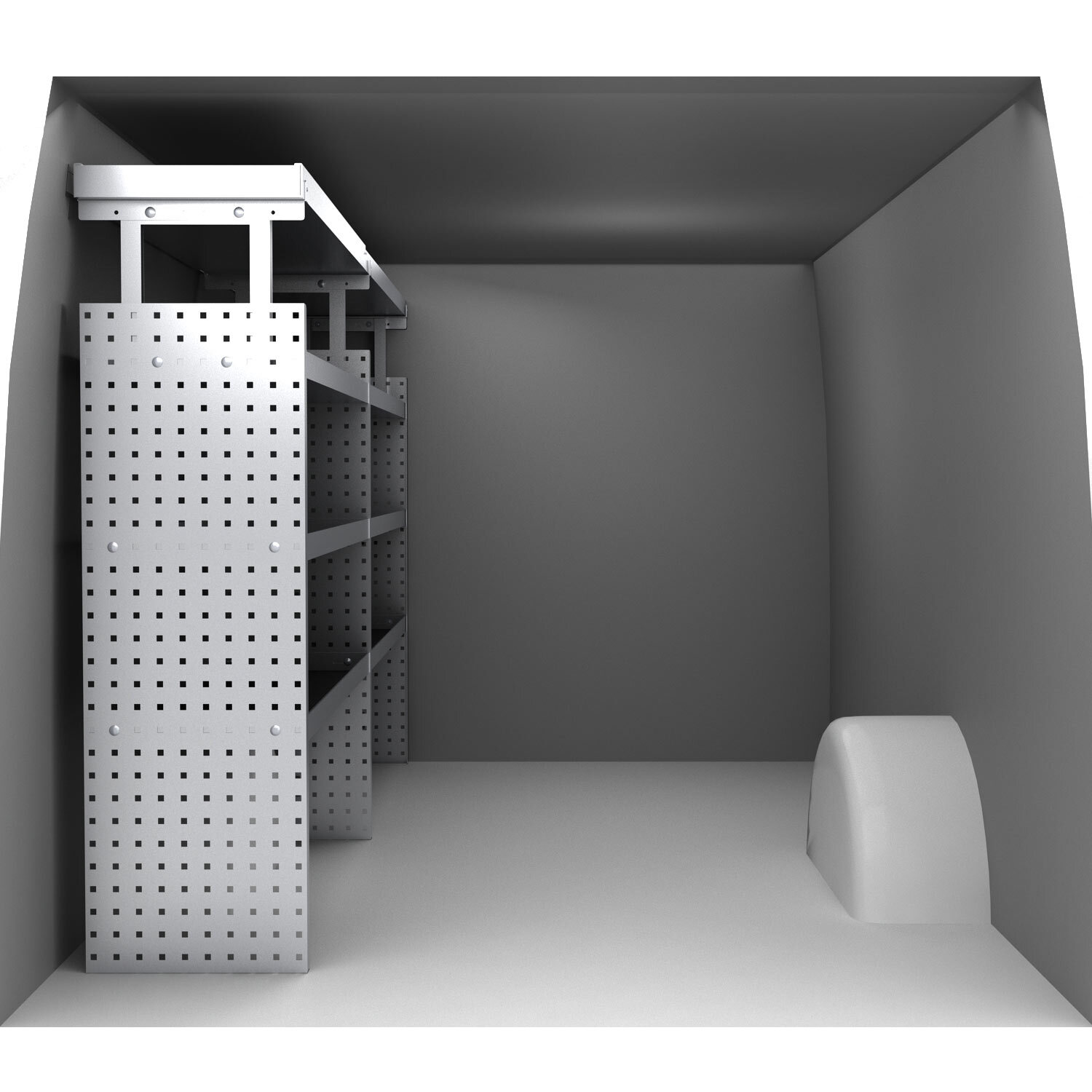 Der er øverst på reolen monteret en tophylde som går i hele bilens længde, perfekt til lister, vatterpas, rør og meget andet.