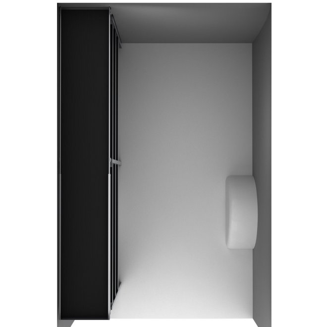 Indretningen er en simpel og stilfuld løsning til universelt brug, og består af en reol i fuld længde i venstre side med 3 gennemgående hylder (opdelt af en gavl midtvejs) med gummimåtte belægning i alle hylderne. Reolen er højden 100 cm, og har en total længde på 200 cm, samt en dybde på 33 cm. Hylderne er som hyldebakker og har en forhøjet kant på 3,5 cm der egner sig perfekt til universel opbevaring af kasser, spande, bøtter, værktøj og meget mere.