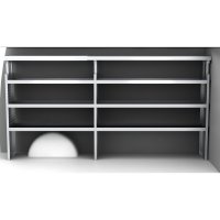 Indretningen er en simpel og stilfuld løsning til universelt brug, og består af en reol i fuld længde i venstre side med 3 gennemgående hylder (opdelt af en gavl midtvejs) med gummimåtte belægning i alle hylderne. Reolen er højden 100 cm, og har en total længde på 230 cm, samt en dybde på 33 cm. Hylderne er som hyldebakker og har en forhøjet kant på 3,5 cm der egner sig perfekt til universel opbevaring af kasser, spande, bøtter, værktøj og meget mere.