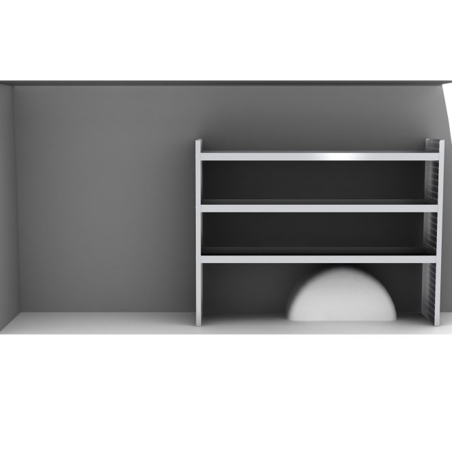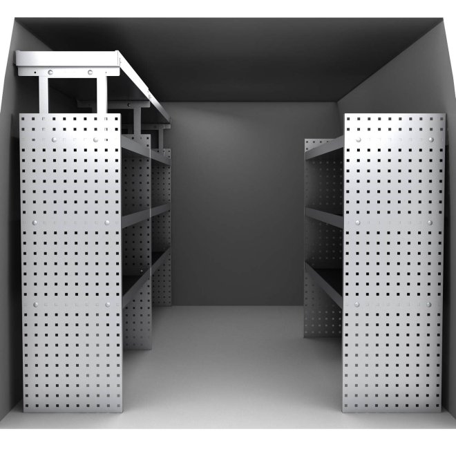 Der er øverst på reolen monteret en tophylde som går i hele bilens længde, perfekt til lister, vatterpas, rør og meget andet.